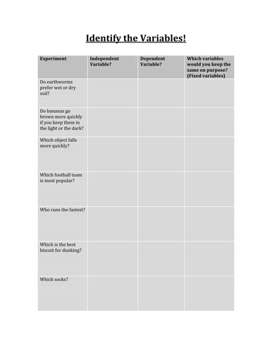 Identifying dependent variables add to my workbooks 2 add to google classroom share through whatsapp. Provided to help you save time as you teach these science results tables worksheets help your students record results of scientific experiments quicker and easier. A variable is used in afair test a variable is any one of the elements of the test which could be changed. A worksheet to get students to identify the independent dependent and control variables.